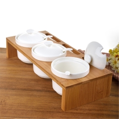 Bộ sản phẩm gồm: 03 hũ có nắp đậy + 03 thìa bằng sứ tráng men gắn ở ngoài + 01 khay gỗ.